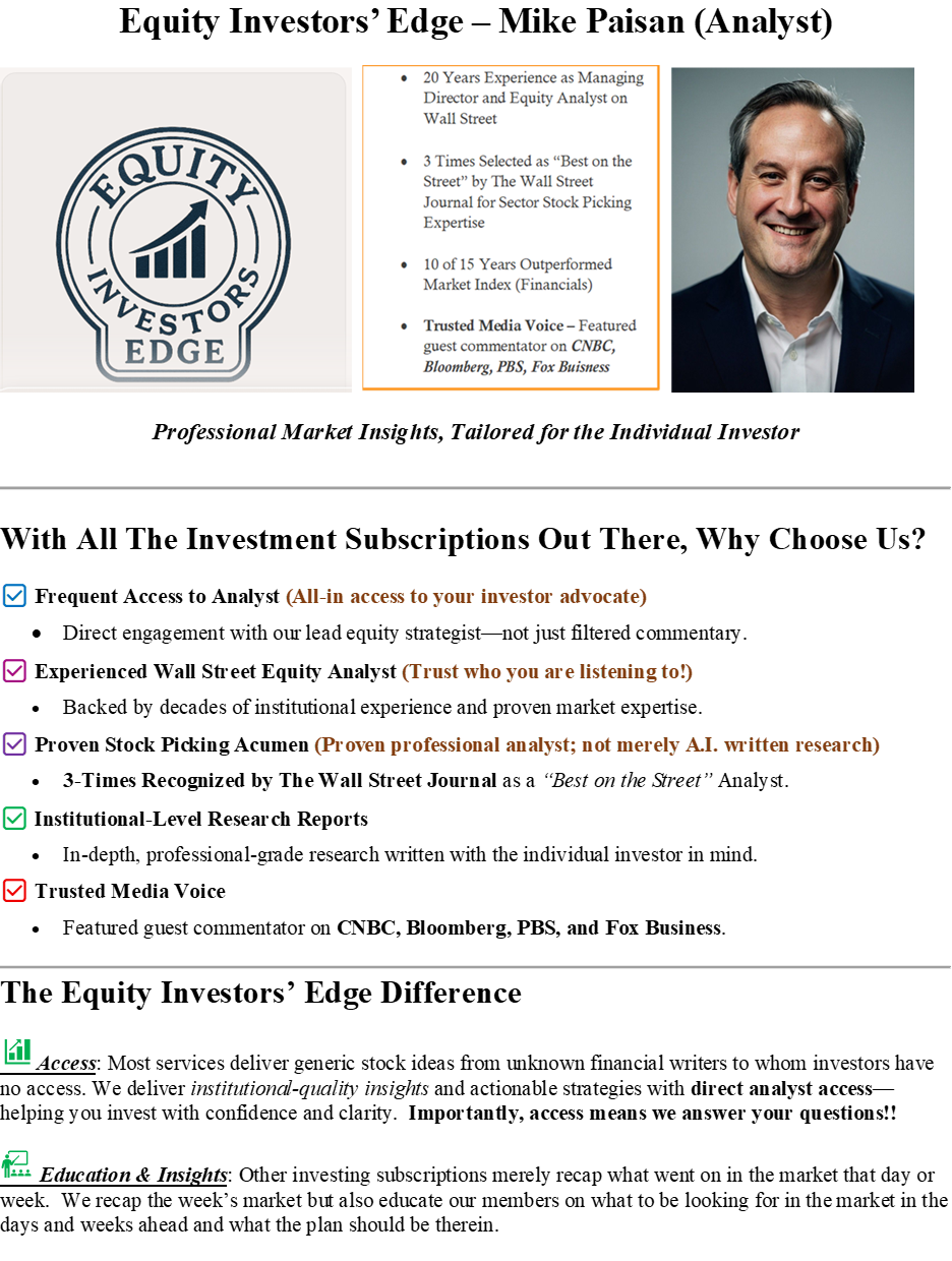 Invest With an Edge!! Subscribe to the experience and insights of a professional equity analyst at Equity Investors’ Edge — Where Wall Street Expertise Meets Main Street Investors